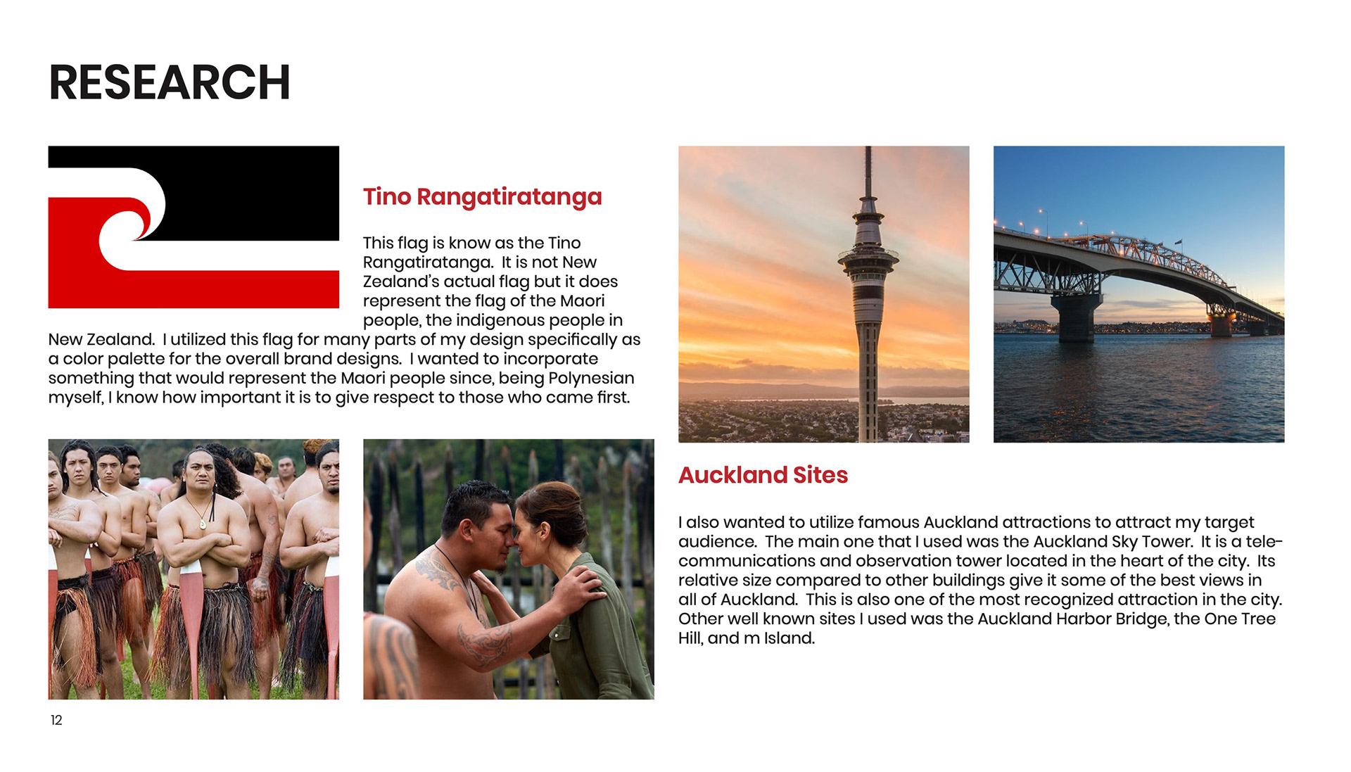 Tourism branding project for the city of Auckland,NZ. I utilized different aspects of New Zealand and Maori culture to come up with various aspects of the different pieces